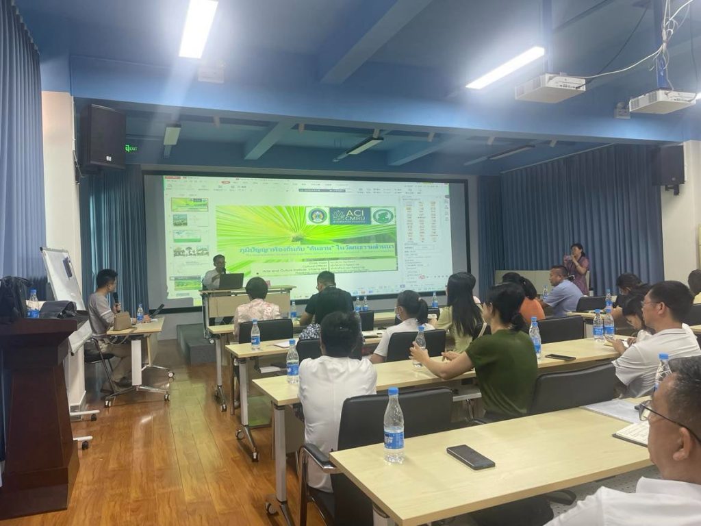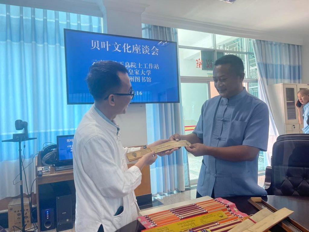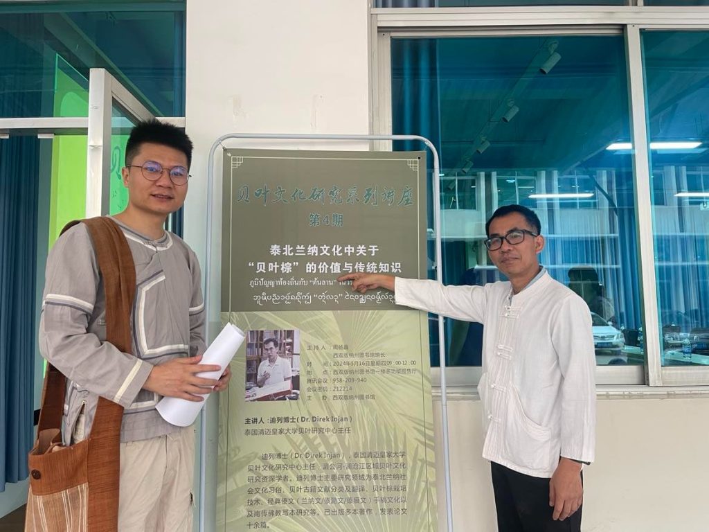 และในวันที่ 16 พฤษภาคม 2567 ร่วมเป็นวิทยากรบรรยายพิเศษ หัวข้อ “The local wisdom on palm tree (Fan Palm, Talipot Palm) in Lan-Na Culture , Northern of THAILAND” (ภูมิปัญญาท้องถิ่นกับ “ต้นลาน” ในวัฒนธรรมล้านนา) ณ ห้องประชุมหอสมุดเขตปกครองตนเองชนชาติไทสิบสองปันนา (Xishuangbanna Dai Autonomous Prefecture Library) มณฑลยูนนาน ประเทศจีน นอกจากนี้ยังร่วมประชุมวางแผนการดำเนินกิจกรรมกับหอสมุดเขตปกครองตนเองชนชาติไทสิบสองปันนา ในการดำเนินกิจกรรมวิชาการด้านเอกสารโบราณ ตามบันทึกข้อตกลงความร่วมมือ (MOU) เมื่อเดือนพฤศจิกายน 2566