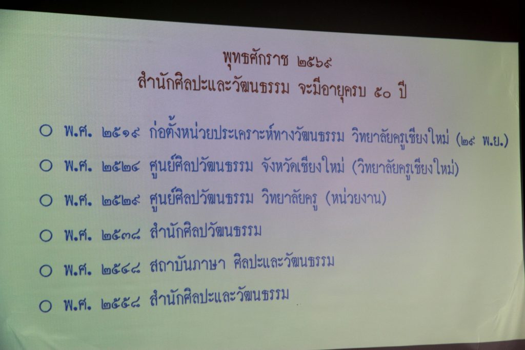 เนื่องในโอกาสครบรอบ 50 ปี สำนักศิลปะและวัฒนธรรม ในปี พ.ศ.2568 โดยมีอดีตผู้บริหาร อาจารย์ ศิษย์เก่าและนักศึกษา เข้าร่วมประชุมการเสวนา เพื่อรวบรวมประวัติและความทรงจำกับหน่วยงานด้านศิลปวัฒนธรรมของวิทยาลัยครูเชียงใหม่ สถาบันราชภัฏเชียงใหม่ และมหาวิทยาลัยราชภัฏเชียงใหม่ บทบาทของมหาวิทยาลัยราชภัฏเชียงใหม่กับงานด้านศิลปวัฒนธรรมท้องถิ่น และบทบาทและความคาดหวังต่อสำนักศิลปะและวัฒนธรรมในอนาคต