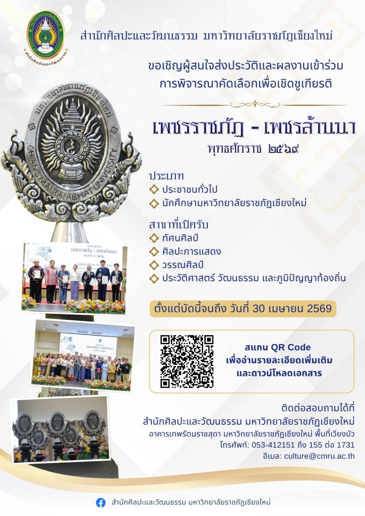 3. ขอเชิญผู้ที่สนใจส่งประวัติและผลงานเข้าร่วม “เพชรราชภัฏ-เพชรล้านนา” ประจำปีพุทธศักราช 2569